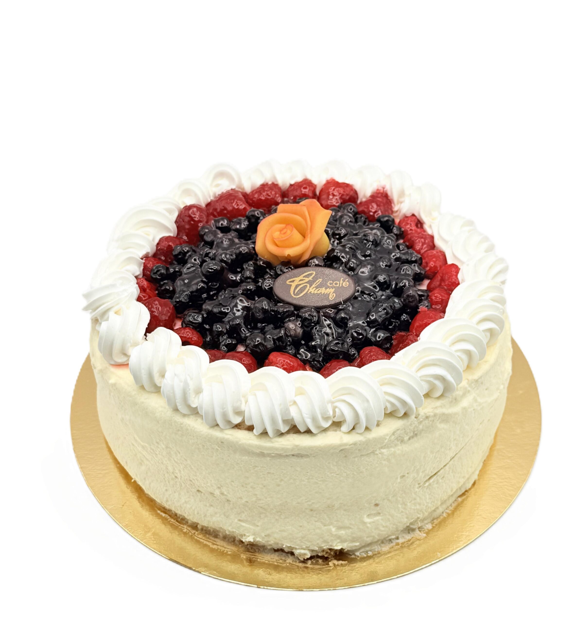 Sockerkaksbotten, Vaniljkräm, Grädde, Gele, Bär (Hallon, Blåbär, Jordgubbar)