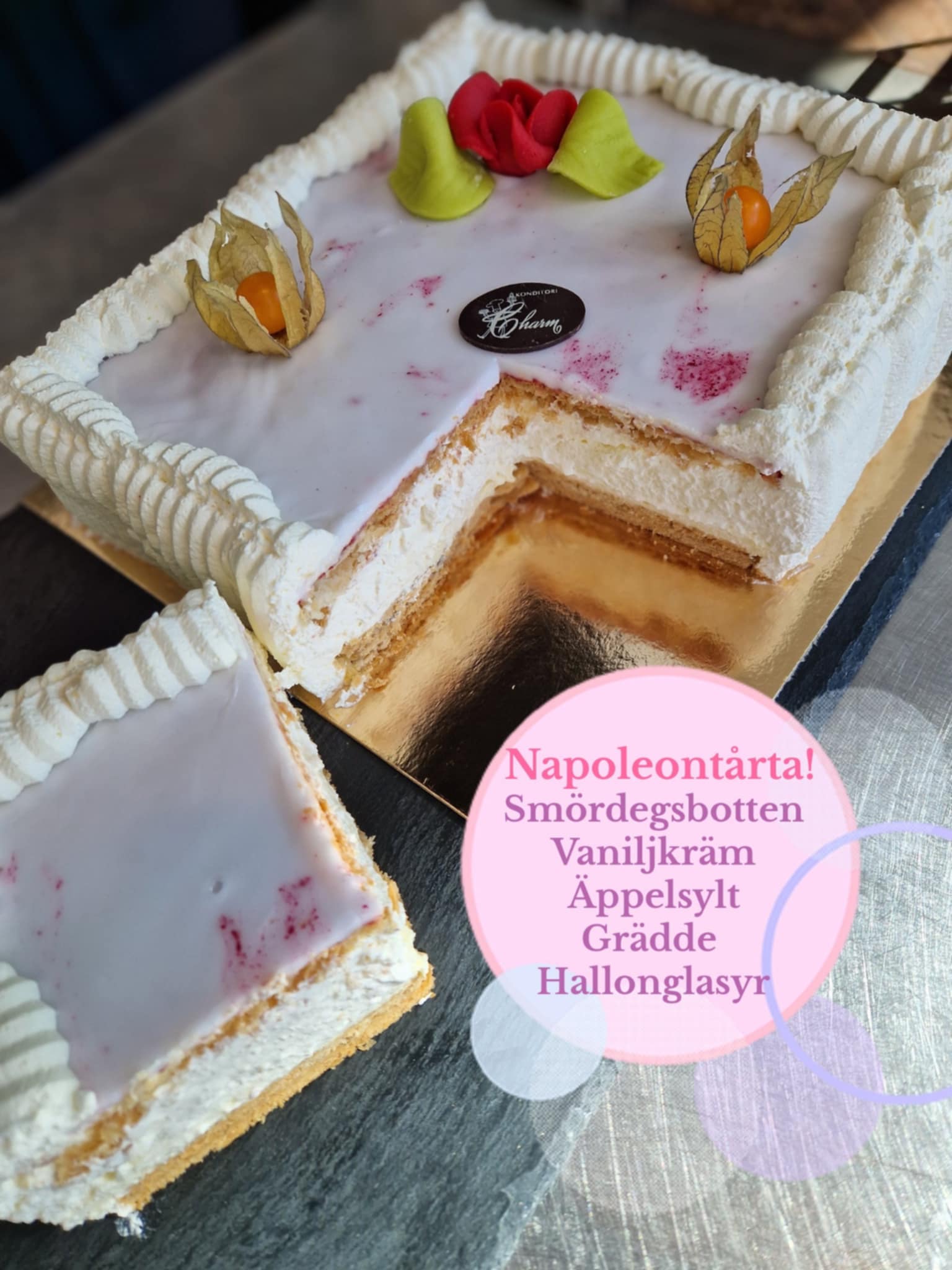 Smördegssbotten, Vaniljkräm, Grädde, Äppelsylt, Hallonglasyr
